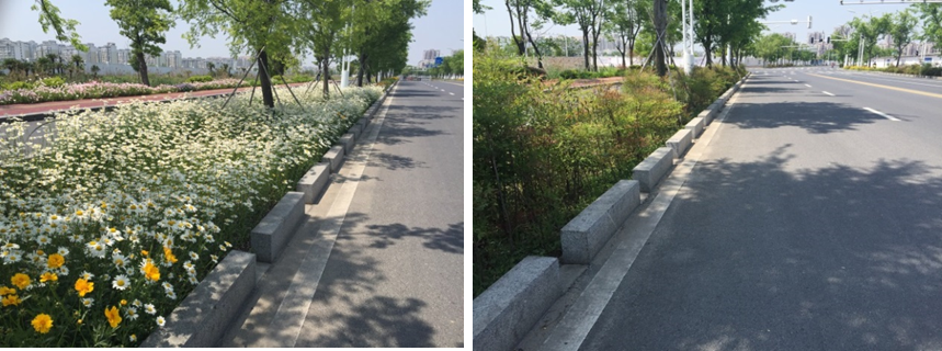 金山湖路设计了断开式路牙作为路面径流流入生态滞留草沟的通道,采用100cm丁型路缘石(高于路面20cm)和30cm戊型路缘石(与路面齐平)间断布置的形式,设置于生态滞留草沟的两侧,道路全线布置。